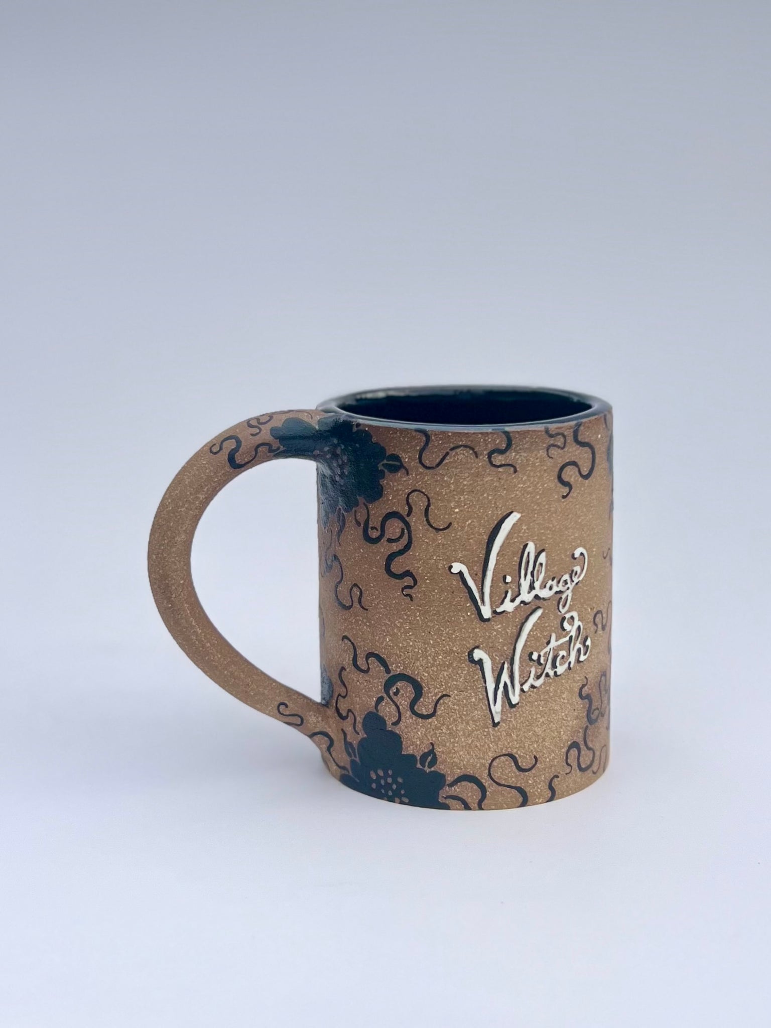 Brown paper bag clay with freehand painted black floral design and retro "Village Witch" text in black and white. Ribbony tendrils and leaves. Glossy black interior glaze. A little floral mug for those who seek magic in their everyday rituals, for dark hearted witches and garden lovers who prefer nighttime strolls, deep and soulful conversation, red roses, and black calla lilies.